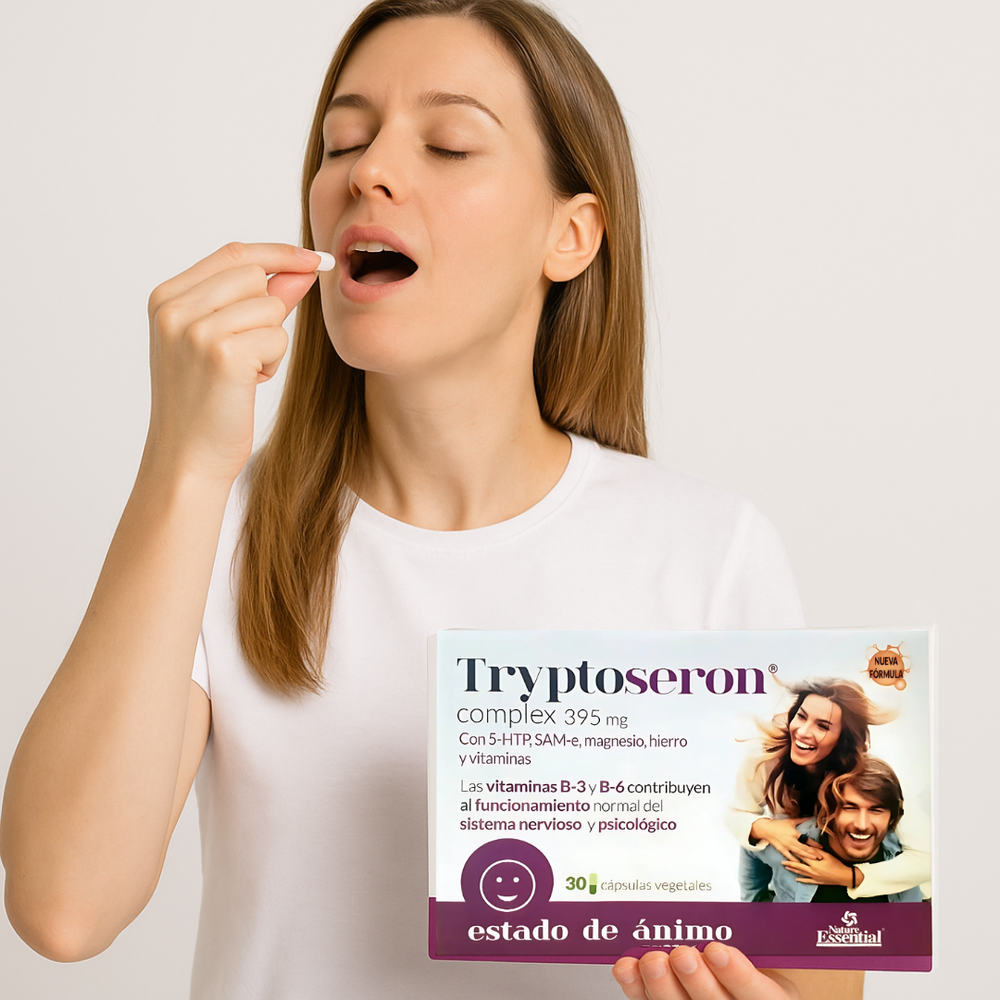 Descubre Tryptoseron Complex 360 mg, la fórmula vegetal de Nature Essential que combina triptófano, SAMe, magnesio, hierro y vitaminas B para ser tu aliado natural del bienestar emocional. En una única cápsula diaria te ofrece serenidad mental, mejor descanso y energía renovada para afrontar cada día con claridad y vitalidad. Ideal para quienes buscan cuidar su ánimo y equilibrio psicológico con ingredientes de calidad.